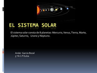El sistema solar consta de 8 planetas: Mercurio, Venus, Tierra, Marte, Júpiter, Saturno, Urano y Neptuno. Cada planeta se describe brevemente, incluyendo su posición en el sistema solar, composición física y nombres derivados de la mitología griega y romana.