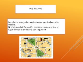 Los planos y croquis nos ayudan a orientarnos y encontrar lugares de forma segura, al proporcionarnos información como las direcciones y detalles sobre la ubicación. Los mapas geográficos representan la superficie terrestre en dos dimensiones para mostrar toda un área o región.