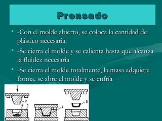 El documento describe diferentes métodos para moldear plásticos: prensado, extrusión, inyección, soplado y laminación. En el prensado se coloca plástico en un molde calentado que toma forma al enfriarse. La extrusión usa un tornillo sin fin para fundir y extruir plástico a través de una boquilla. La inyección inyecta plástico fundido en un molde. El soplado introduce aire en un tubo plástico calentado dentro de un molde. La laminación estira láminas