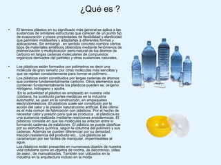 Los plásticos son materiales sintéticos formados por polímeros que pueden ser moldeados cuando se calientan. Se componen principalmente de carbono unido en largas cadenas. Existen diferentes tipos de plásticos como termoplásticos, termoestables y elastómeros. Los plásticos se usan ampliamente en la vida cotidiana y la industria debido a sus propiedades como su bajo costo, ligereza, resistencia a la corrosión y maleabilidad. El reciclaje de plásticos es importante para redu