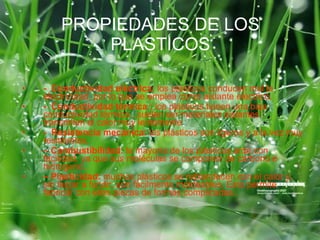 Los plásticos son materiales flexibles, resistentes y aislantes del calor y la electricidad que se fabrican a bajo costo. Existen diferentes tipos de plásticos como termoplásticos, termoestables y elastómeros que varían en su capacidad de reciclaje y moldeo. Los plásticos se procesan mediante técnicas como inyección, extrusión, soplado y moldeo para fabricar una amplia variedad de objetos.