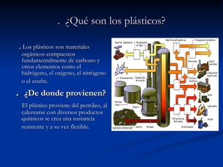 Los plásticos son materiales orgánicos compuestos principalmente de carbono que se obtienen mediante la polimerización de derivados del petróleo y el gas natural. Existen tres tipos principales de plásticos: termoplásticos, cuyas moléculas se mueven libremente y pueden derretirse y moldearse; termoestables, con moléculas entrelazadas que no se pueden remodelar; y elastómeros, con moléculas en red que les dan elasticidad. Algunos plásticos comunes son
