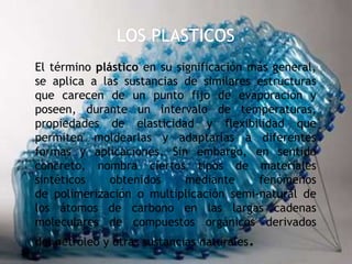 Este documento trata sobre los plásticos. Explica que los plásticos son polímeros sintéticos derivados principalmente del petróleo que pueden ser moldeados cuando se calientan. Se clasifican en termoplásticos, que pueden moldearse varias veces, y termoestables, que mantienen su forma una vez moldeados. También describe los principales procesos para producir objetos de plástico, como la extrusión, el moldeo por inyección y el termoconformado.