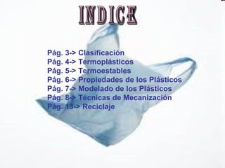 Este documento trata sobre los diferentes tipos de plásticos, sus clasificaciones, propiedades y técnicas de modelado y mecanización. Explica que los plásticos se clasifican en termoplásticos y termoestables y proporciona ejemplos de cada tipo. También describe métodos comunes para dar forma a los plásticos como inyección, compresión, extrusión y soplado. Por último, cubre temas como marcado, corte, taladrado y formas de unión de piezas plásticas.
