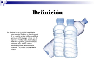 El documento proporciona información sobre los plásticos. Explica que los plásticos son materiales sintéticos derivados de productos como el petróleo y el gas natural. Se descubrieron en la década de 1860 y su desarrollo aumentó en la década de 1900 con el descubrimiento de plásticos sintéticos como la baquelita. Actualmente, los plásticos se usan ampliamente debido a su bajo costo, ligereza y resistencia química. Sin embargo, tardan siglos en degradarse,