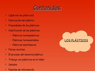 El documento proporciona información sobre los plásticos. Explica que los plásticos están compuestos de macromoléculas formadas por la unión de monómeros en cadenas poliméricas. Describe los procesos de fabricación, las propiedades, y las clasificaciones principales de los plásticos termoplásticos, termoestables, y elastómeros. También cubre el proceso de dar forma a los objetos de plástico y ofrece consejos sobre el trabajo con plásticos y su reciclaje para proteger