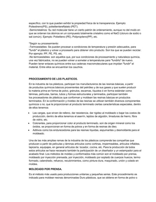 Los plásticos son compuestos de polímeros con aditivos químicos. Se originaron en 1860 con el desarrollo del celuloide y en 1909 con la baquelita, el primer plástico sintético. Existen varios tipos de plásticos y métodos de procesamiento como la inyección, soplado, termoformado y extrusión para producir una amplia gama de productos.