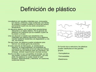 El documento proporciona información sobre varios tipos de plásticos, incluyendo sus definiciones, propiedades y usos. Describe plásticos como el poliuretano, PET, ABS, fenoplásticos, nailon, policarbonato, acrílico y más, detallando sus características y aplicaciones comunes. El documento ofrece una visión general de la diversidad de materiales plásticos y cómo se utilizan en una amplia gama de productos y sectores.