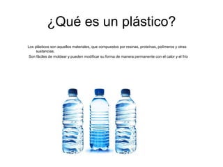 Los plásticos son materiales compuestos por polímeros que pueden moldearse fácilmente con calor o frío. Existen plásticos naturales derivados de plantas y plásticos sintéticos derivados del petróleo, siendo estos últimos los más comunes. Los plásticos se clasifican en termoplásticos, termoestables y elastómeros dependiendo de su capacidad de moldeo y reciclaje.