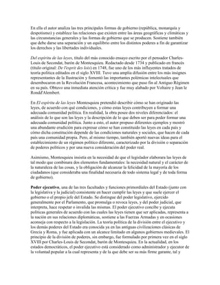 El documento describe los tres poderes del Estado - el poder ejecutivo, legislativo y judicial - así como la teoría de la separación de poderes propuesta por Montesquieu. Explica que el poder ejecutivo gobierna el Estado y hace cumplir las leyes, el poder legislativo elabora las leyes, y el poder judicial ejerce la justicia de manera independiente. También detalla la estructura del poder judicial en México.