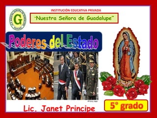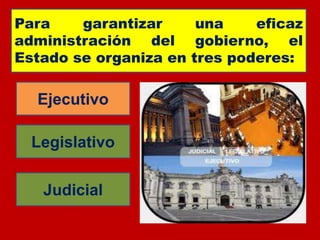 Este documento presenta información sobre los tres poderes del Estado en Perú: el poder ejecutivo, legislativo y judicial. Explica que el poder ejecutivo está encabezado por el Presidente y sus ministros, el legislativo reside en el Congreso de 130 miembros electos por cinco años, y el judicial administra justicia a través de la Corte Suprema, cortes superiores y juzgados a nivel regional y local.