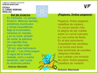 Este documento contiene una selección de poemas en lengua castellana del autor Antonio Machado. En particular, incluye los poemas "Sol de invierno", "Pegasos, lindos pegasos", "Los sueños", "Las moscas", "Los cantos de los niños", "Caminante no hay camino", "Yo voy soñando caminos" y "Al olmo blanco". También presenta poemas de otros autores como Juan Ramón Jiménez y Federico García Lorca.