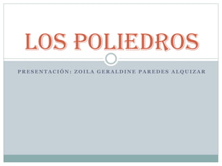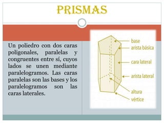 Este documento presenta fórmulas para calcular áreas y volúmenes de diferentes poliedros como prismas, pirámides, cilindros y conos. Explica que un prisma es recto cuando sus aristas laterales son perpendiculares a las bases, y proporciona fórmulas para calcular su área lateral, área total y volumen. También define una pirámide como un poliedro con una sola cara poligonal y varias caras laterales triangulares compartiendo un vértice común, y ofrece fórmulas similares