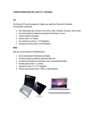 Este documento compara las características de los computadores personales (PC) y los computadores Mac. Explica que los PC funcionan con Windows u Linux, tienen baterías extraíbles y pesan entre 1 a 3 kilos, mientras que los Mac son fabricados por Apple y funcionan con el sistema operativo Mac OS. También analiza los sistemas operativos Windows, Linux y Mac OS, y discute las ventajas y desventajas de los PC y Mac. El autor concluye que aunque está más familiarizado con Windows, le gustaría probar un Mac debido a su diseño y tecn