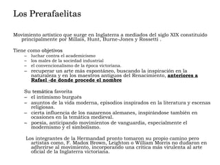 El movimiento artístico de los Prerrafaelitas surgió en Inglaterra a mediados del siglo XIX como una reacción contra el academicismo y el convencionalismo de la época victoriana. Buscaron inspiración en la naturaleza y en los maestros anteriores a Rafael para crear un arte más espontáneo, con temas que incluían la vida burguesa moderna e historias inspiradas en la literatura y la religión. Artistas como Millais, Hunt, Rossetti y Burne-Jones fueron fundadores del movimiento prerrafael