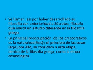Los filósofos presocráticos griegos se preocuparon principalmente por explicar la naturaleza y el origen de las cosas. Propusieron diferentes principios materiales como el agua, el aire y el fuego. Aunque no estuvieron de acuerdo en cuál era el principio fundamental, coincidieron en que la naturaleza podía explicar los cambios en el universo y en que el pensamiento debía basarse en la razón más que en los sentidos.
