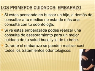 El documento ofrece recomendaciones sobre el cuidado bucodental durante el embarazo y la primera infancia. Aconseja realizar una consulta odontológica antes y durante el embarazo para prevenir gingivitis y caries. También explica los cambios hormonales que ocurren durante el embarazo y cómo afectan la salud bucal. Recomienda amamantar al bebé y tener cuidado con los biberones para prevenir caries.