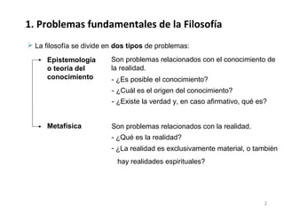 Este documento explora varios problemas fundamentales de la filosofía como el conocimiento y la realidad. Se divide la filosofía en epistemología, que estudia el conocimiento, y metafísica, que estudia la realidad. Analiza si es posible el conocimiento y, de ser así, cuál es su origen. Explora las posiciones racionalista, empirista y apriorista sobre el origen del conocimiento. También examina si existe la verdad y la realidad, y las teorías del realismo, idealismo y materialismo sobre la relación mente-cerebro