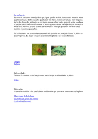 El documento describe varios problemas comunes que afectan las plantas de un huerto, incluyendo plagas causadas por insectos, ácaros y pájaros, así como enfermedades causadas por hongos y bacterias. También discute cómo las condiciones ambientales pueden causar fisiopatías en las plantas. Entre los problemas específicos mencionados se encuentran las hormigas, la mosca blanca, la araña roja, las orugas, el pulgón, el oidio, el espigado de la lechuga y la pudrición y ag