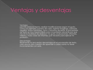 Ventajas: permite elaborar textos,realizar modificaciones según mi gusto, como por ejemplo: cambio de color, insertar imagenes, subrayar, negrillas, titulos centrados, tipos y tamaños de letras. El procesador de texto es muy inprencidible para mi profesión docente por que me dá la facilidad de elaborar mis guias, evaluaciones, informes, talleres y toda clase de informes que necesito para ejercer mi profesión. Desventajas Realmente no encuentro desventajas en el procesador de texto, creo que es solo cuestión de aprender a usarlo paras no tener inconvenientes con este.