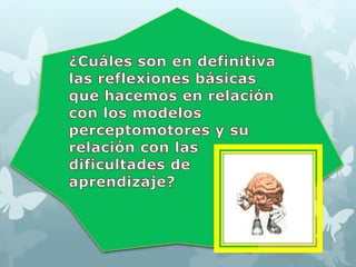 El documento describe varias pruebas y aspectos relacionados con la percepción y el desarrollo de habilidades motrices y cognitivas en niños. Explica el Reversal Test, que mide la madurez en la lectoescritura en niños de 6 años evaluando su capacidad para identificar figuras iguales y diferentes. También discute conceptos como la discriminación perceptiva, la integración sensorial, la coordinación visuomotora y la memoria auditiva secuencial.