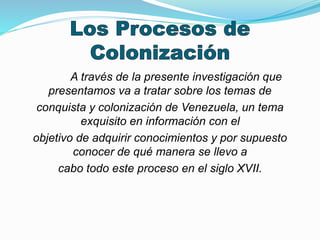 Este documento resume la historia de la conquista y colonización de Venezuela en el siglo XVII. Cristóbal Colón llegó a las costas de Venezuela en 1498. En 1499, Américo Vespucio y Alonso de Ojeda exploraron la región y le dieron el nombre de Venezuela. Los españoles fundaron muchas ciudades importantes como Coro, Valencia, Barcelona y Caracas. Caracas se convirtió en la sede de la Capitanía General de Venezuela, que dependía del Virreinato de Santa Fé de Bogotá.