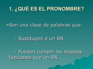 El documento describe los diferentes tipos de pronombres, incluyendo pronombres personales, demostrativos, posesivos, indefinidos, numerales, relativos y el uso del pronombre "se". Explica que los pronombres sustituyen a un sintagma nominal y pueden cumplir las mismas funciones. Detalla las formas y usos de cada tipo de pronombre.