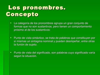 El documento describe los diferentes tipos de pronombres en español. Explica que los pronombres pueden ser personales, posesivos, demostrativos, numerales, indefinidos, interrogativos, exclamativos o relativos. Detalla las formas y usos de los pronombres personales tónicos y átonos, así como ejemplos de otros tipos de pronombres como los posesivos, demostrativos y numerales.