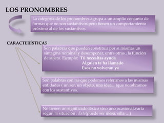 Este documento describe las diferentes clases de pronombres en español, incluyendo sus características, funciones y formas. Explica los pronombres personales, posesivos, demostrativos, numerales, indefinidos, interrogativos, exclamativos y relativos.