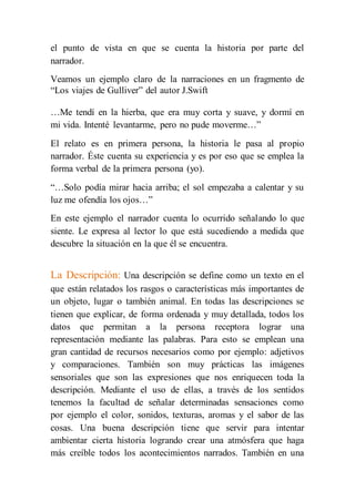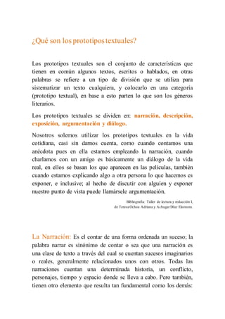 Los prototipos textuales son categorías de textos basadas en sus características comunes. Los cinco principales prototipos son la narración, la descripción, la exposición, la argumentación y el diálogo. La narración cuenta sucesos de forma ordenada, la descripción describe objetos y lugares de manera detallada, la exposición explica temas para transmitir conocimiento, la argumentación intenta persuadir al lector de un punto de vista, y el diálogo recrea conversaciones entre personas.