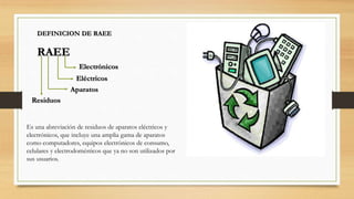 El documento presenta información sobre los residuos de aparatos eléctricos y electrónicos (RAEE), su clasificación y tipos de obsolescencia. También discute la Ley 1672 de 2013, que establece directrices para la gestión integral de los RAEE y los principios rectores, como la responsabilidad extendida del productor y la participación activa de los involucrados. Se aborda cómo esta ley busca regular el manejo diferenciado de estos residuos en Colombia.