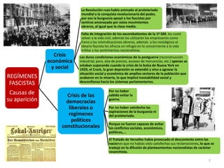 Este documento resume los regímenes fascistas que se implantaron en Europa en las décadas de 1920 y 1930. Explica que fueron dictaduras cuya ideología era ultraconservadora, ultranacionalista y antiliberal. Describe las causas de su aparición como la crisis económica y social tras la Primera Guerra Mundial y la Revolución Rusa, así como la falta de integración de los excombatientes y la crisis de las democracias liberales. Resalta los principios políticos, sociales y económicos del fascismo como la supremac
