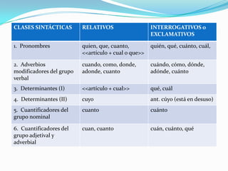 Este documento explica los diferentes tipos de relativos en español, incluyendo pronombres, adverbios y determinantes relativos. Describe las clases sintácticas de los relativos interrogativos y exclamativos, y proporciona ejemplos de cada tipo. También explica las oraciones de relativo y las diferencias entre explicativas y especificativas.
