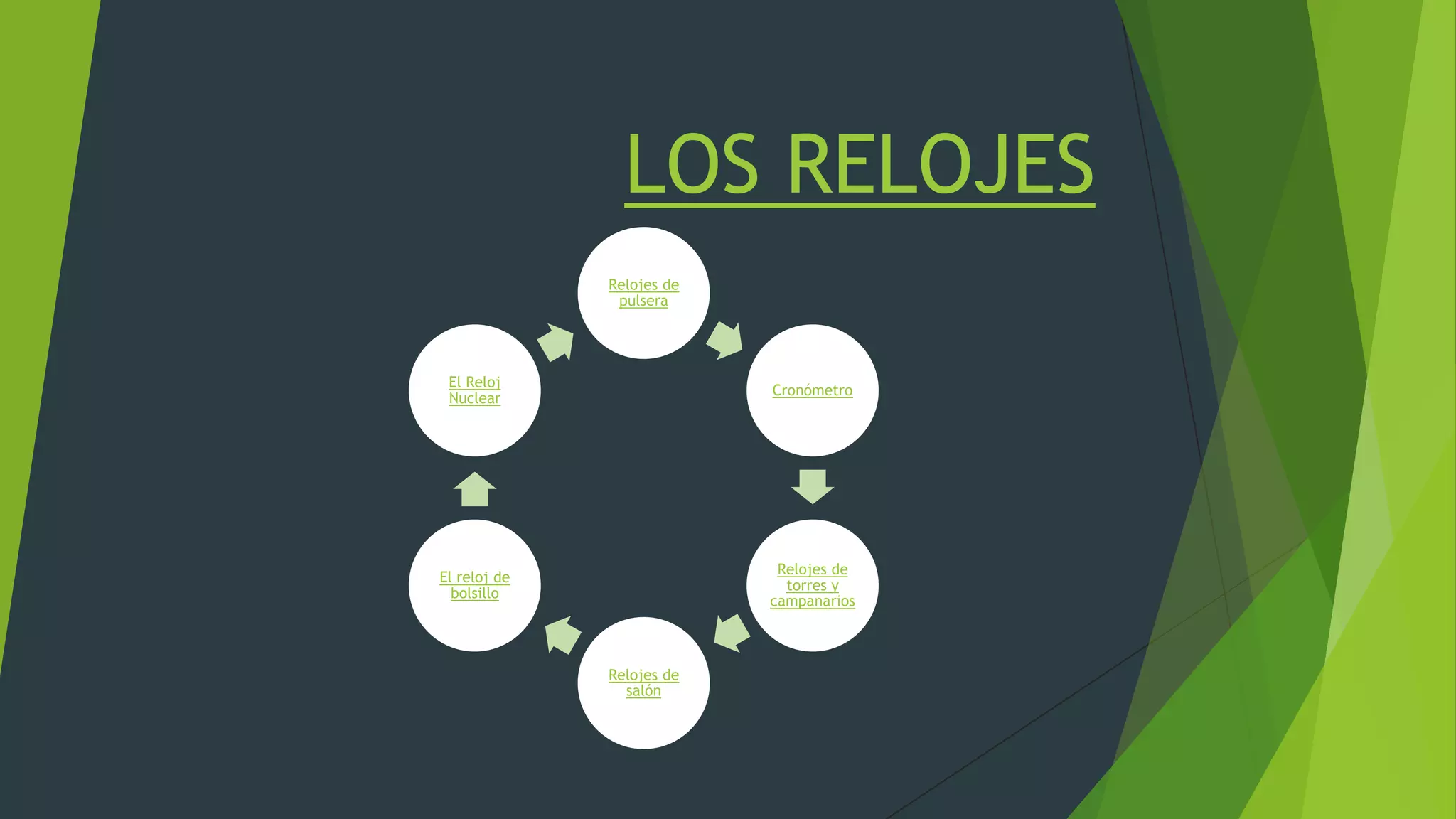 Los diferentes tipos de relojes incluyen relojes de pulsera, cronómetros, relojes de torres y campanarios, relojes de salón y relojes nucleares. Los relojes de pulsera vienen en versiones analógicas y digitales y se usan comúnmente. Los cronómetros son relojes precisos utilizados para medir intervalos de tiempo. Antes, los grandes relojes de torres y campanarios indicaban públicamente la hora. Los relojes también se usaban como decoración en salones.