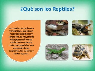 Los reptiles son animales vertebrados con sangre fría, respiración pulmonar y cuerpo cubierto principalmente de escamas. La mayoría tienen cuatro extremidades, aunque las serpientes carecen de ellas. Son terrestres o acuáticos, ovíparos con fecundación interna, y se dividen en saurios, ofidios, quelonios y cocodrilianos.