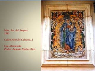 Este documento proporciona una lista de retablos cerámicos en Sevilla, incluyendo su nombre, fecha de creación, ubicación, taller o pintor asociado. Se enumeran más de 30 retablos con detalles sobre su ubicación en iglesias y calles de Sevilla y los artistas involucrados en su creación. La lista parece ser parte de un directorio más amplio de obras religiosas en cerámica en la ciudad.