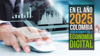 El documento describe los avances y retos de la economía digital en Colombia. Se ha visto una alta adopción de infraestructura tecnológica básica pero se necesita mejorar el uso de tecnologías más avanzadas, especialmente entre las pequeñas y medianas empresas. La economía digital colombiana está progresando pero algunos sectores se retrasan; se espera que la digitalización mejore la productividad en los próximos años. La industria de TI juega un papel clave para continuar impulsando la economía digital.