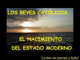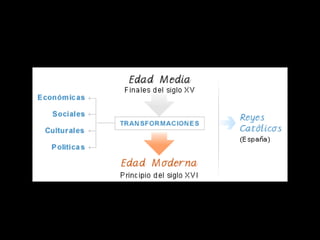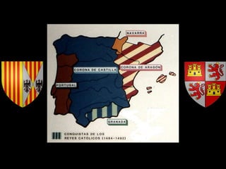 El documento describe la unificación política y territorial de España bajo los Reyes Católicos Isabel de Castilla y Fernando de Aragón a finales del siglo XV. Resalta la conquista de Granada en 1492, la incorporación de Navarra y las Islas Canarias, y el matrimonio dinástico que unió Castilla y Aragón. También destaca los esfuerzos para consolidar el poder real, lograr la unidad religiosa católica, y establecer las bases del Estado moderno español.