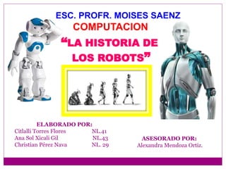 Este documento presenta una breve historia de los robots, describiendo algunos de los primeros robots creados como Shakey en 1960 y el Caballero Mecánico diseñado por Leonardo da Vinci en 1495. También define qué es un robot, sus componentes básicos y características como su movimiento, energía, grados de libertad y tipos como robots industriales, móviles y médicos. Finalmente, menciona ejemplos de robots como ATLAS, Stanley y los rovers Spirit y Opportunity.
