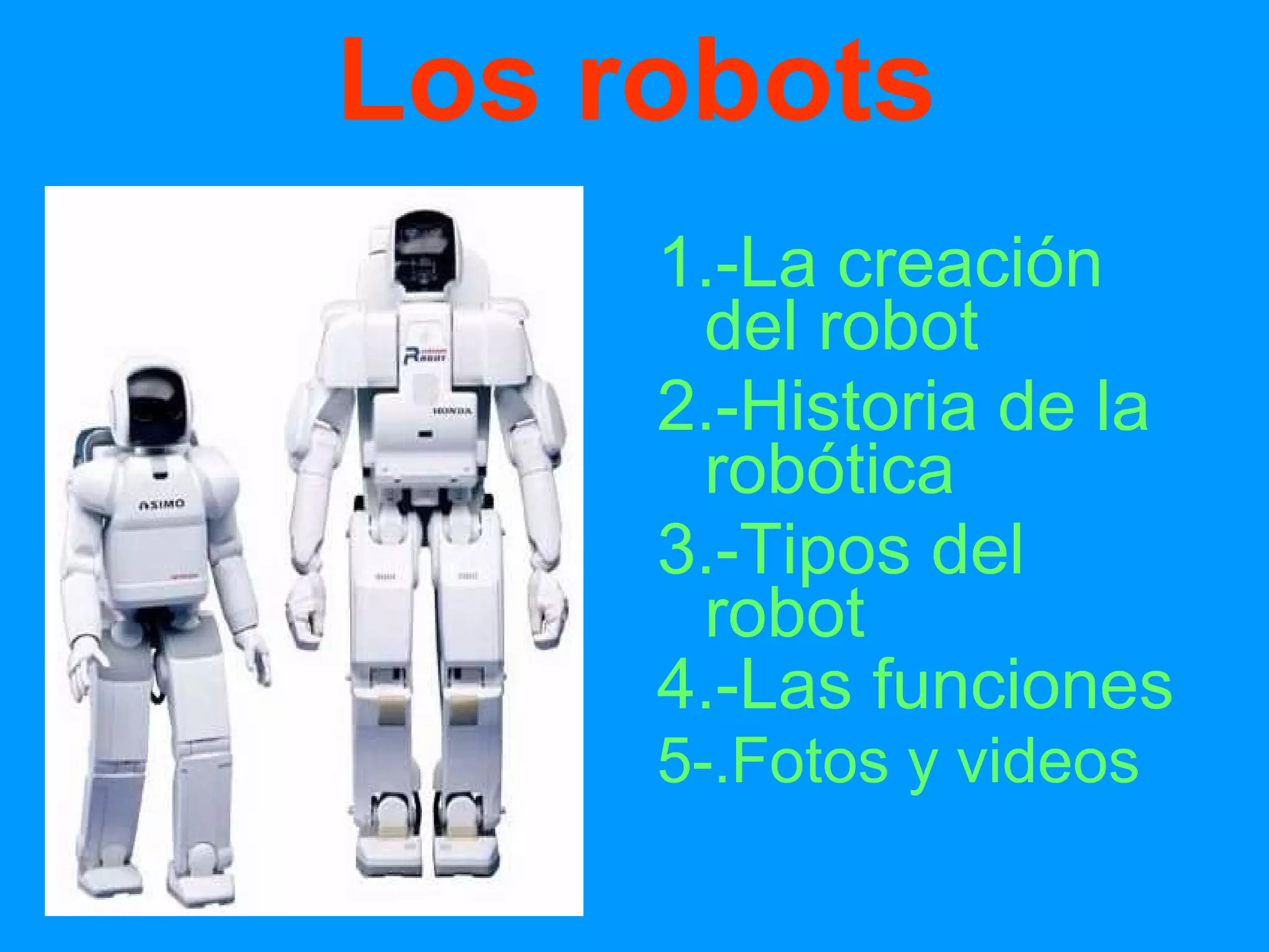 Este documento resume la historia y tipos de robots. Comienza describiendo cuando se acuñó el término "robot" en una obra de teatro checa en 1921. Luego describe hitos clave en el desarrollo de la robótica como las tres leyes de la robótica de Isaac Asimov en 1942, el primer robot programable comercial en 1954 y el establecimiento del Instituto de Robótica en la Universidad Carnegie Mellon en 1965. Finalmente, clasifica diferentes tipos de robots como bípedos, rovers y humanoides.
