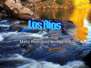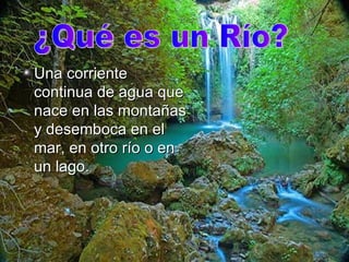 Este documento describe los conceptos básicos de los ríos, incluyendo su curso, caudal y régimen. Explica los elementos que componen un río como torrentes, lagos y embalses. Además, detalla las tres principales vertientes hidrográficas de España - Cantábrica, Mediterránea y Atlántica - y enumera algunos de los ríos más importantes en cada una.
