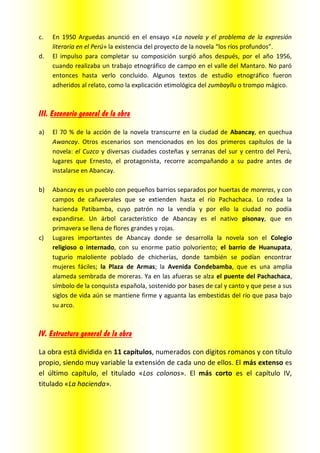 Este documento resume la novela "Los ríos profundos" de José María Arguedas. La novela narra el viaje de Ernesto, un niño de 13 años, con su padre por el Perú andino y su estancia posterior en la ciudad de Abancay. Explora temas como el poder y las injusticias sociales a través de la experiencia de Ernesto. El título se refiere a los ríos como representación de la cultura indígena olvidada. La obra captura el mundo mítico y la unidad de los indígenas con la naturaleza a trav