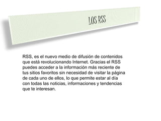 El documento presenta el RSS como un medio eficiente para acceder a información actualizada de sitios web sin visitarlos directamente, facilitando la suscripción a contenidos y evitando el spam. Describe varias herramientas y servicios, como Netvibes y My Yahoo!, que utilizan RSS para personalizar y gestionar noticias y feeds. Además, menciona RSSOwl como una aplicación recomendada para usuarios de Google Reader, permitiendo la sincronización y el intercambio de información en redes sociales.