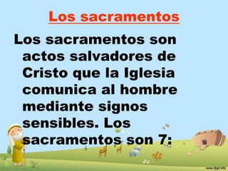 Este documento describe los siete sacramentos de la Iglesia Católica, que son actos salvadores de Cristo comunicados a través de signos sensibles. Los sacramentos se dividen en tres categorías: iniciación (bautismo, confirmación y eucaristía), curación (penitencia y unción de los enfermos) y servicio a la comunidad (matrimonio y orden sacerdotal).