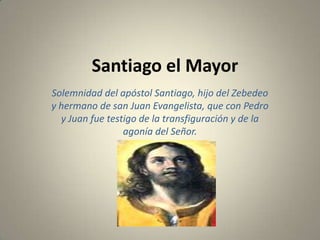 Santiago el Mayor fue uno de los doce apóstoles de Jesús. Fue testigo de la transfiguración y agonía de Jesús. Según los evangelios, Santiago estuvo involucrado en el milagro de la hija de Jairo y fue testigo de la oración de Jesús en el Monte de los Olivos. Sus reliquias se encuentran en el monasterio de Cañas y es el patrón de España y numerosas ciudades y pueblos.