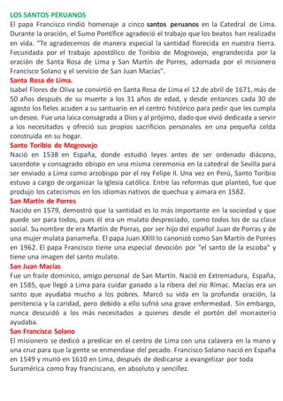El Papa Francisco rindió homenaje a cinco santos peruanos en la Catedral de Lima, agradeciendo su trabajo apostólico: Toribio de Mogrovejo, Santa Rosa de Lima, San Martín de Porres, el misionero Francisco Solano y San Juan Macías. Los santos vivieron vidas dedicadas a servir a Dios y a los necesitados en Perú entre los siglos XVI y XVII.