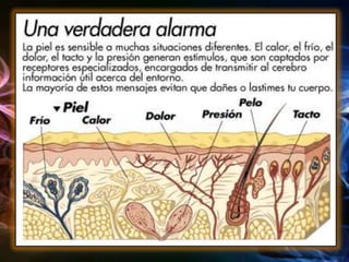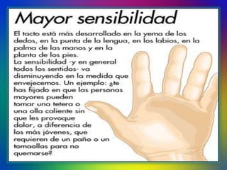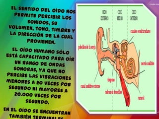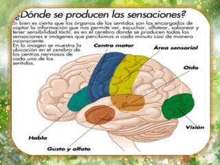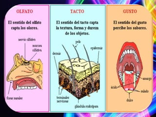 El documento describe los cinco sentidos principales del cuerpo humano: la vista, el oído, el olfato, el tacto y el gusto. La vista nos permite ver objetos, su tamaño, forma y color. El oído nos informa de los sonidos del entorno. El olfato detecta los olores a través de la nariz. El tacto percibe la textura, temperatura y dureza de los objetos. El gusto identifica los cuatro sabores básicos de los alimentos.