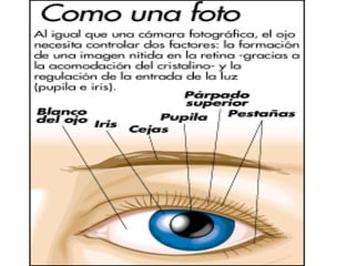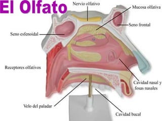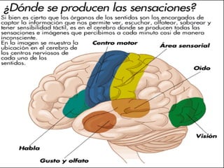 El documento describe los cinco sentidos humanos (vista, oído, olfato, gusto y tacto). Cada sentido está asociado con un órgano sensorial específico (ojos, oídos, nariz, lengua y piel, respectivamente) que detecta estímulos como la luz, los sonidos, los olores, los sabores y las texturas. El documento también proporciona detalles sobre las partes anatómicas involucradas en cada sentido.