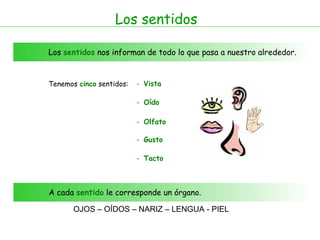 Este documento describe los cinco sentidos humanos: la vista, el oído, el olfato, el gusto y el tacto. Para cada sentido, se especifica el órgano correspondiente (ojos, oídos, nariz, lengua y piel) y la información que proporciona sobre el entorno. También se detallan las partes internas y externas de los ojos y los oídos. El documento explica que la lengua puede detectar cuatro sabores básicos y que la piel puede sentir la dureza, la temperatura y la textura de los