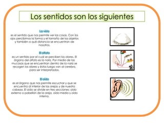 Los cinco sentidos principales son la vista, el olfato, el oído, el gusto y el tacto. Cada uno involucra un órgano diferente como los ojos, la nariz, las orejas, la lengua y la piel, y nos permite percibir el mundo que nos rodea a través de la luz, los olores, los sonidos, los sabores y las sensaciones táctiles.